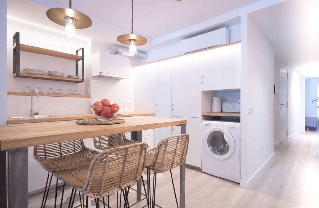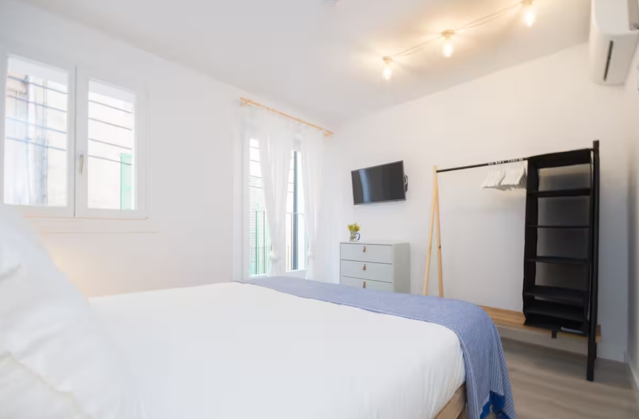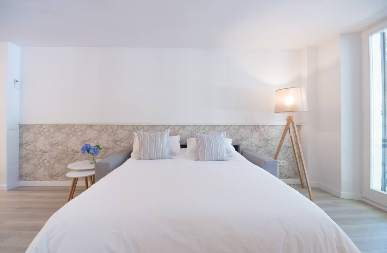 Frente al Palacio Real de Almudaina, se encuentra en la primera planta. El ascensor te permitirá entrar directamente, Este alojamiento tiene una elegante entrada que te lleva a la cocina de planta abierta. La cocina está totalmente equipada (lavadora-secadora, lavavajillas, tostadora, exprimidor, microondas, caldera, cafetera…) y está abierta al salón. También tiene una mesa alta y sillas. La sala de estar es luminosa y espaciosa. Tiene un pequeño balcón y ventana para disfrutar de las vistas. También hay una zona de lectura con una mecedora, un cómodo sofá cama de diseño italiano (160 cm x 200 cm). El apartamento se encuentra en el barrio de La Lonja. Uno de los más modernos de Palma.
