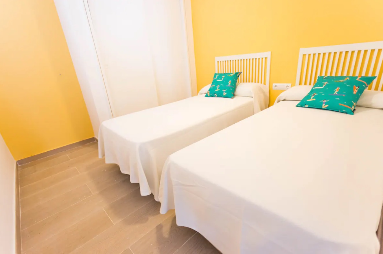 1 dormitorio con cama de matrimonio, otro con 2 camas individuales + sofa cama en el salón.