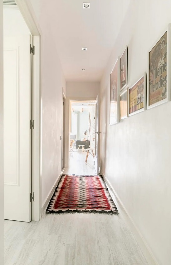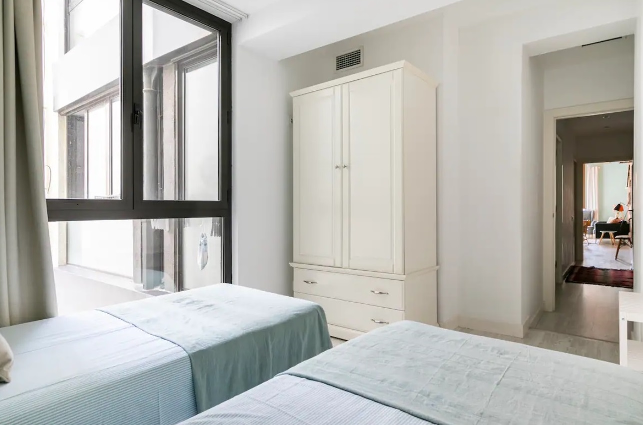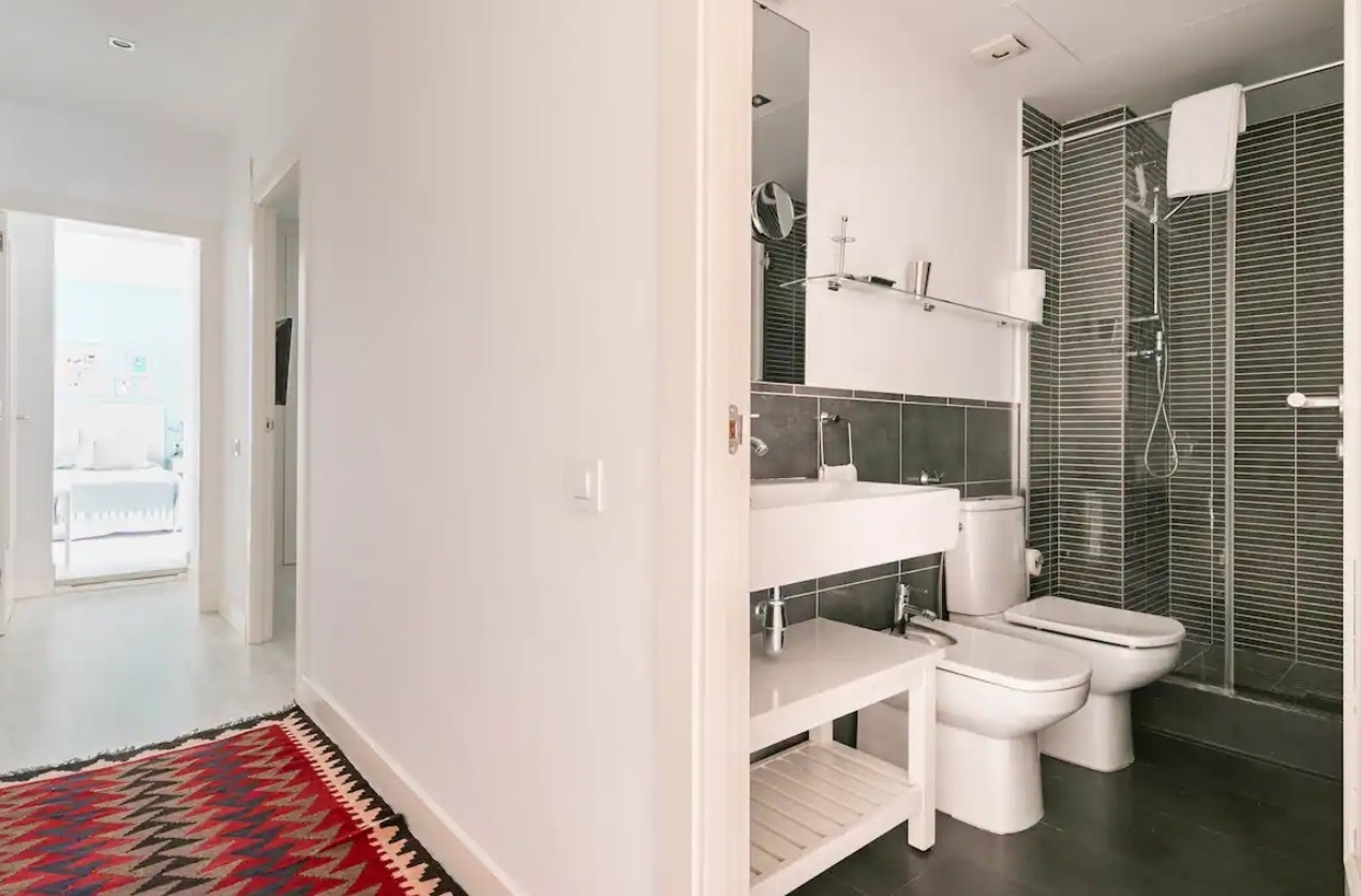 Segundo dormitorio con camas individuales y segundo baño completo en el pasillo.