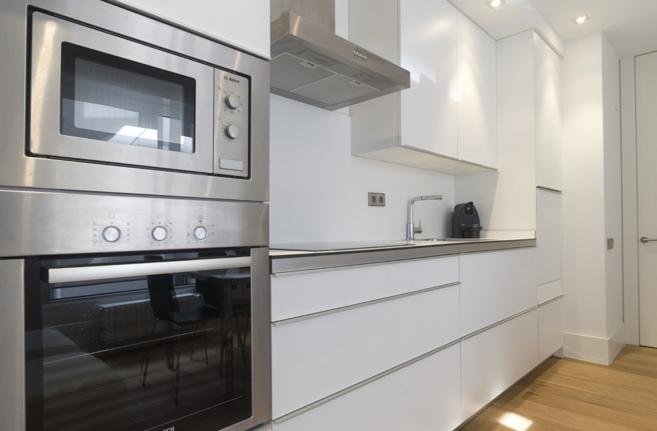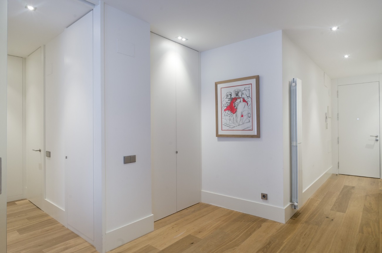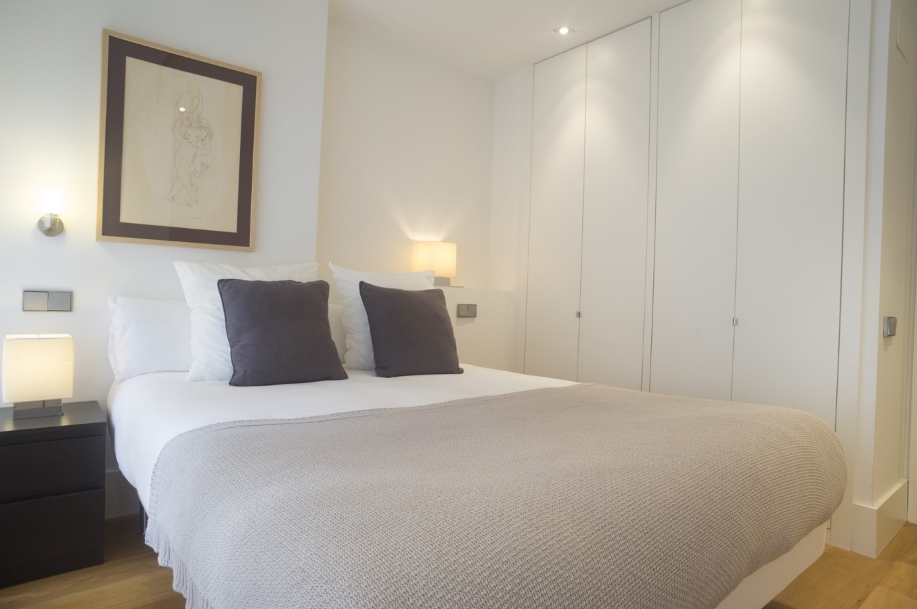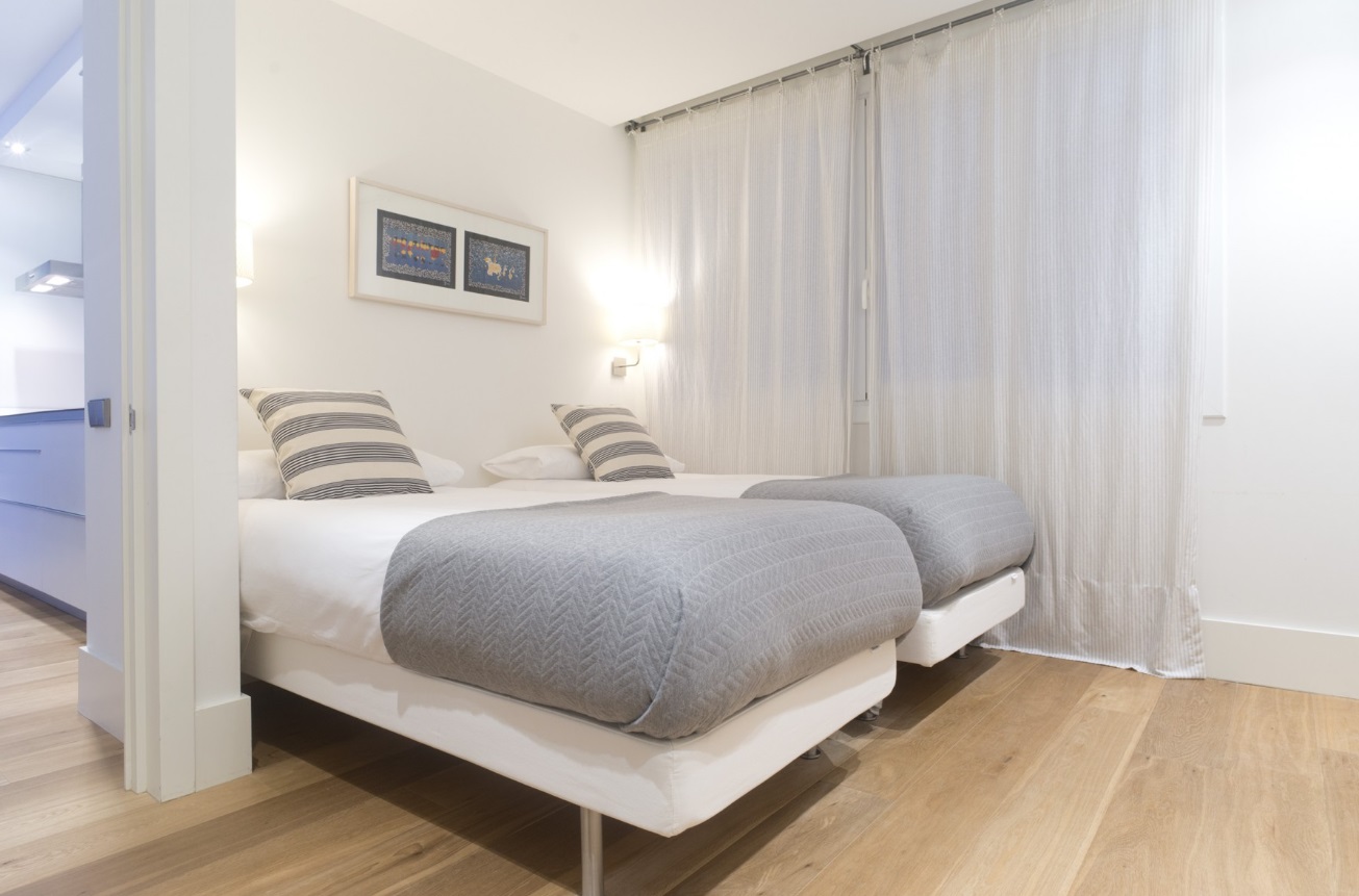 El apartamento cuenta con todo tipo de comodidades. Está orientado a un amplio y luminoso patio de manzana y ocupa la segunda planta de un edificio con ascensor. Cuenta con dos dormitorios dobles, un moderno salón-comedor, dos cuartos de baño con amplios platos de ducha y una espaciosa cocina abierta, equipada con electrodomésticos de alta gama y menaje de cocina completo. El dormitorio principal dispone de una cama de matrimonio de 160 cm y el otro ofrece dos camas individuales de 90 cm. Los dos cuartos de baños están incorporados en los dormitorios. Es perfecto para una pequeña familia o dos parejas de amigos. Este apartamento dispone de parking privado.