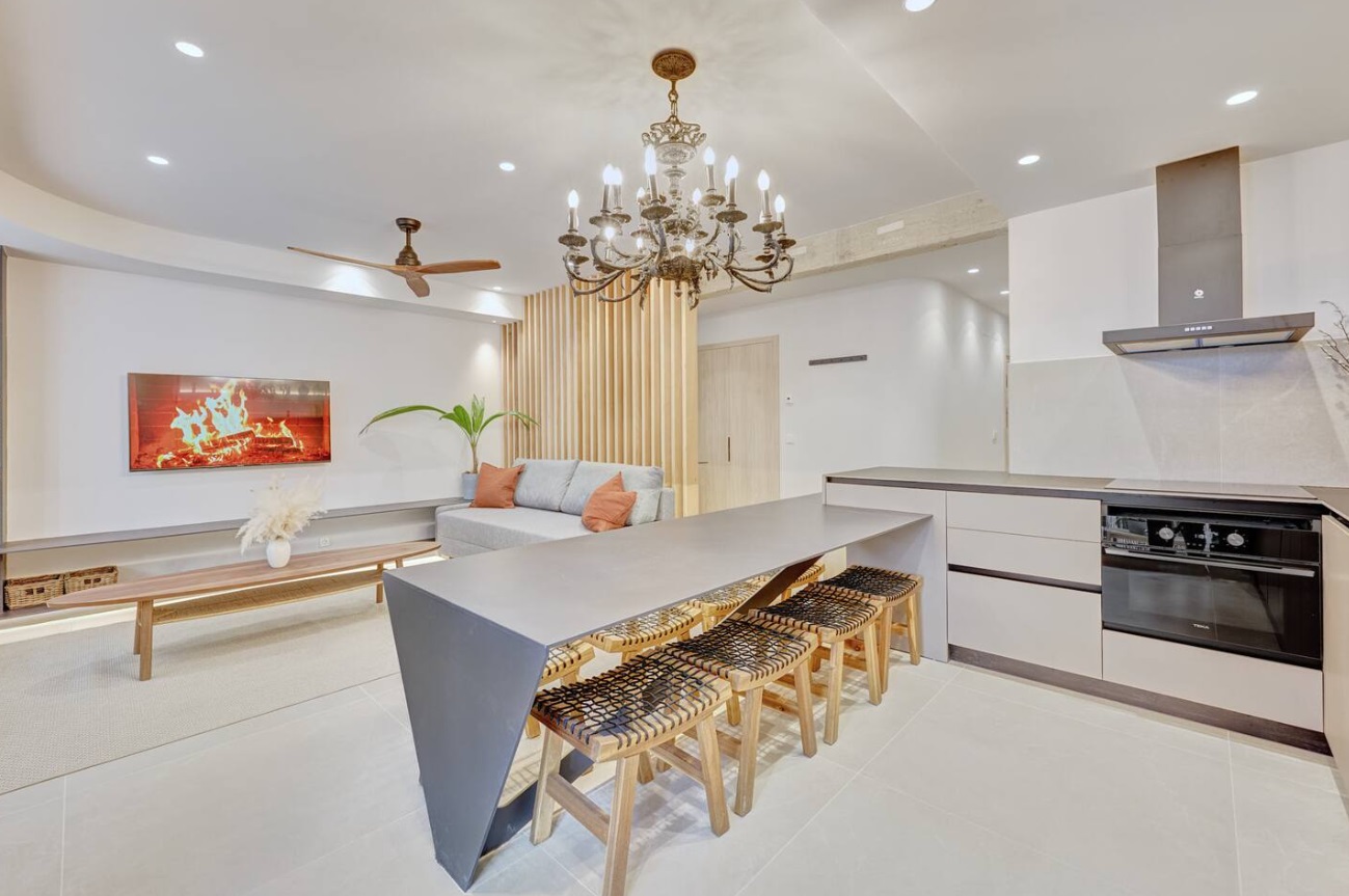 El apartamento cuenta con un amplio y luminoso salón comedor, así como una cocina abierta totalmente equipada. Dispone de 4 habitaciones: tres con camas dobles y una con dos camas individuales, todas en perfectas condiciones para garantizar un descanso óptimo durante vuestras vacaciones. También consta dos sofás cama para 2 personas cada uno.