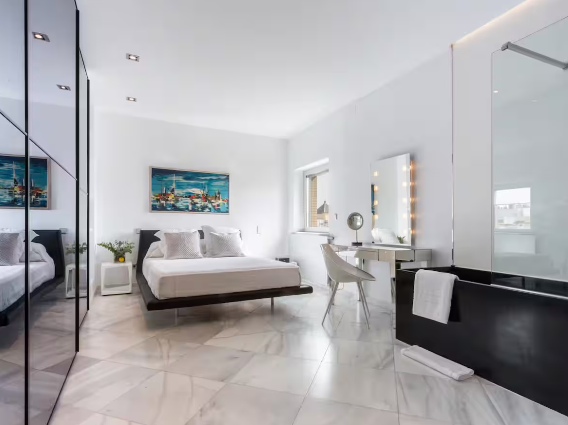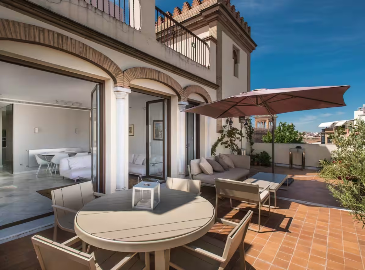 Cuenta con 140 m2 distribuidos en dos dormitorios con baños en suite, amplio salón diáfano con salida directa a la terraza, aseo de cortesía con acceso desde salón y cocina totalmente equipada.El salón, con vistas desde todos los ángulos a la Giralda y la Catedral, cuenta con sofá de diseño de grandes dimensiones, televisión de 55 pulgadas, equipo de sonido de alta fidelidad Sonos, y sistema Apple TV para disfrutar de todo tipo de contenidos. Asimismo cuenta con una mesa de comedor para 6 comensales.La terraza panorámica de 40 m2, a la que se accede desde el salón a través de tres grandes vanos abalconados, cuenta con vistas excepcionales e inéditas de la zona monumental de la ciudad. Dispone de una zona lounge con sofás y mesa baja para momentos de relax, una zona de comedor con capacidad para cuatro comensales y una zona de solárium con hamaca y ducha para tomar el sol y refrescarse en los días de calor.