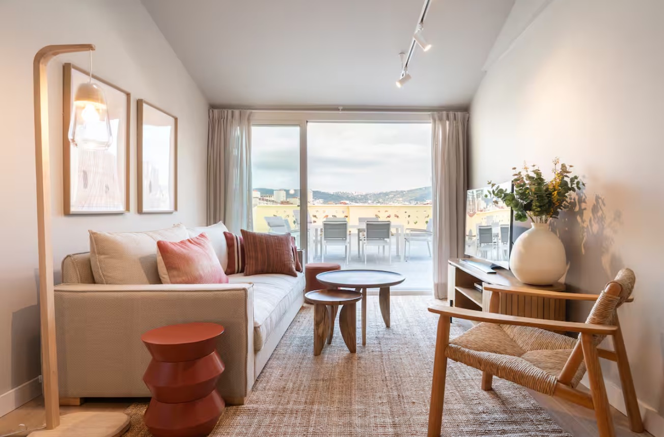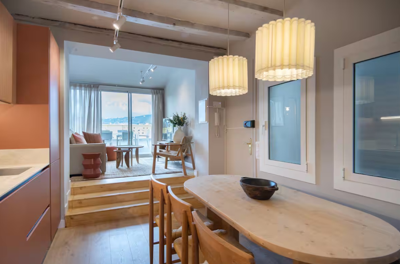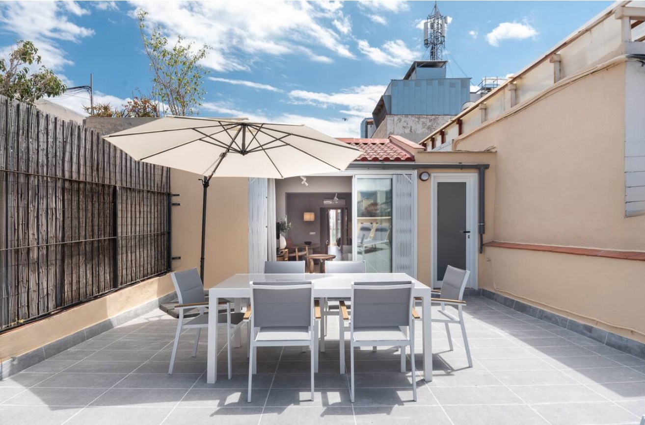 No tengas dudas que recordarás este hogar como uno de los mejores que has estado. En este ático recien reformado, con una espectácular terraza y vistas soñadas, disfrutarás cada momento de tu estancia. Cada detalle ha sido pensado para el bienestar de los huéspedes, con un moderno diseño, excelente climatización y todas las comodidades que te mereces en una ubicación privilegiada. El apartamento cuenta con tres dormitorios, el primero de ellos con cama Queen Size y baño en suite, otro dormitorio con dos camas individuales juntas que componen una gran cama de 180cm y el restante con dos camas individuales. Todos los dormitorios tienen bomba de frio calor. Desde el salón, con un cómodo sofá, Smart TV y un potente AC, se accede a la espéctacular terraza con preciosas vistas y los mejores atardeceres que los invitará a disfrutar el cálido clima de Barcelona. Hacia el otro lado del salón se encuentra una moderna cocina integrada y completamente equipada, una zona de comedor y un segundo baño completo para total cómodidad de los huéspedes. El apartamento está totalmente equipado, con recursos optimizados para una mayor sostenibilidad y con tecnología aplicada al bienestar, controladores inteligentes de temperatura para una óptima climatización durante toda la estancia, Wifi de alta velocidad, Smart TV, toallas, ropa de cama, champú, acondicionador, gel de ducha, 4 bombas de frio-calor, lavadora, lavaplatos, plancha, y una amplia variedad de utensilios para cocinar.