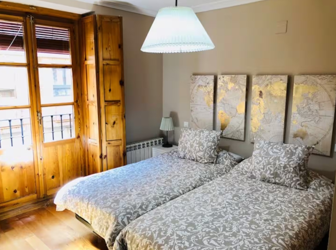 A 1 minuto de la plaza Mayor, en plena zona de tapas, restaurantes y comercio. Vista a plaza de Martí y Monsó (Coca). Transporte público próximo. El piso consta de dos habitaciones (con televisión y camas individuales), dos baños (toallas, secador de pelo, gel, champú), cocina (horno, microondas, lavadora-secadora, lavavajillas, frigorífico, plancha, cafetera, tostador, batidora, exprimidor eléctrico, olla y todo tipo de menaje) y salón comedor. WIFI.