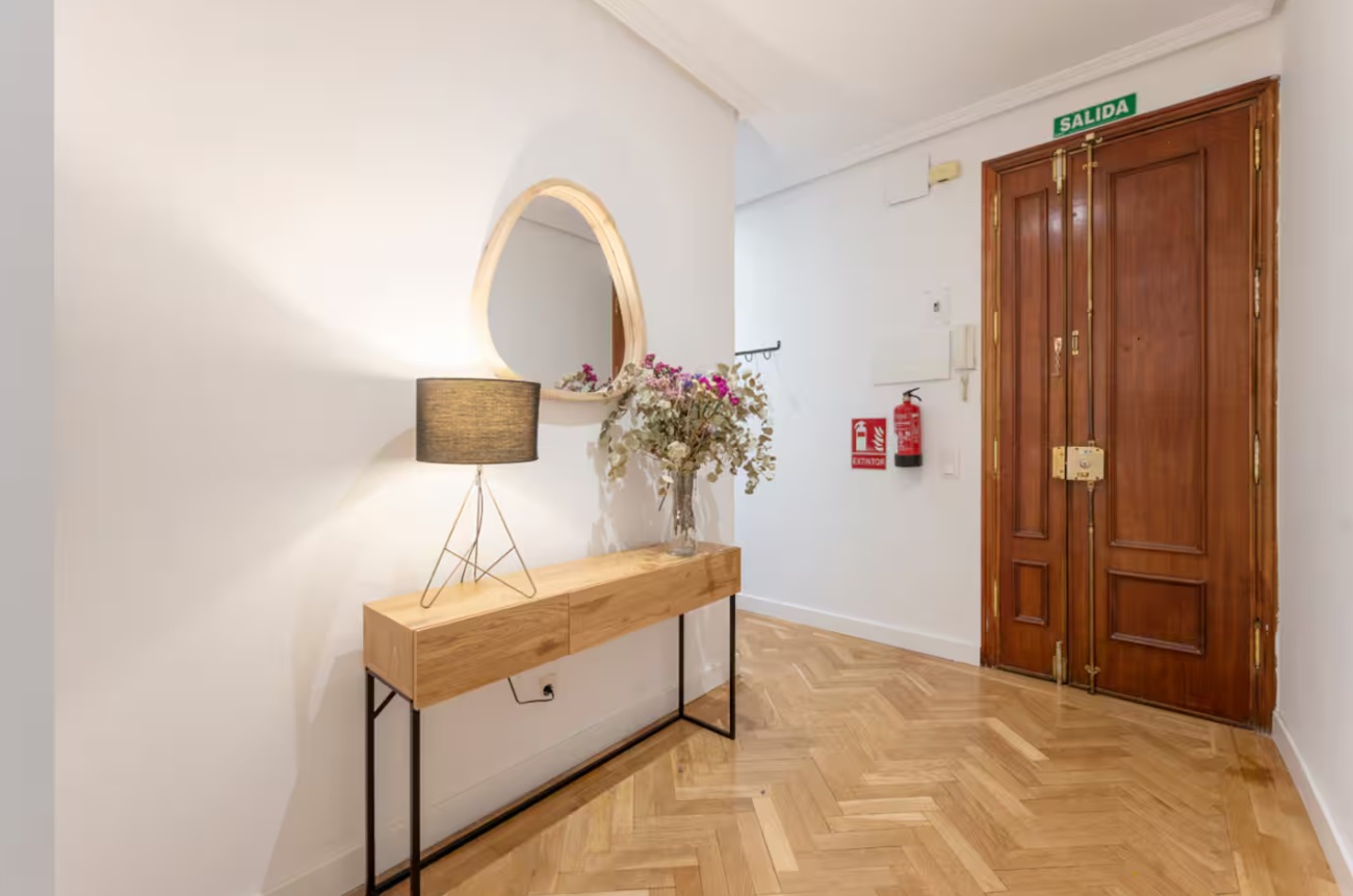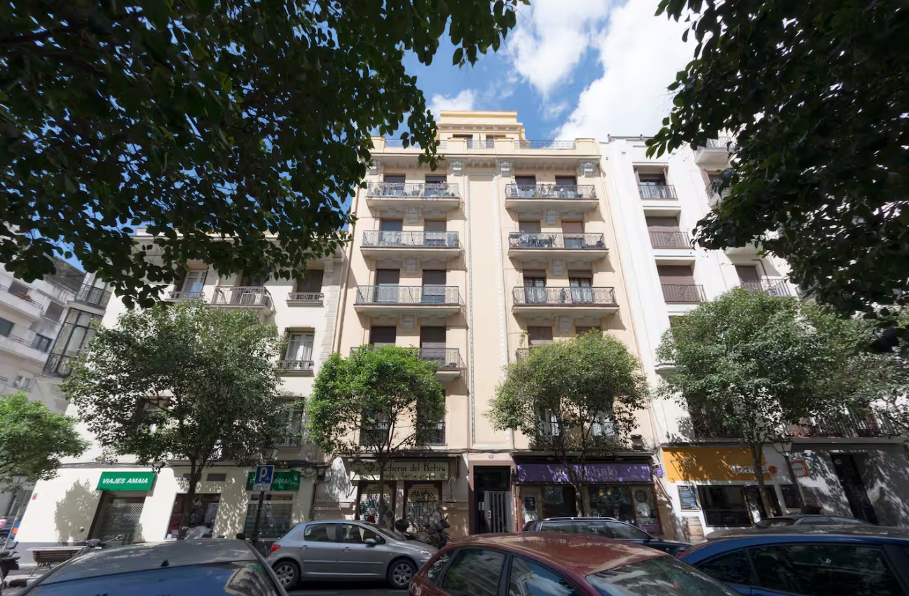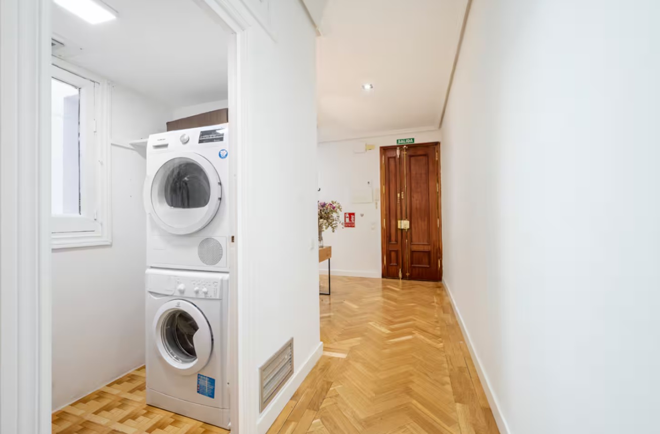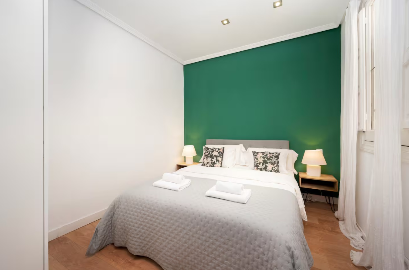 Es un piso señorial, espacioso y lleno de luz, decorado con elegancia y sencillez. El salón-comedor es muy luminoso y tiene dos balcones que dan a la calle Lope de Rueda. El comedor tiene capacidad para seis comensales. El apartamento dispone de dos dormitorios, el principal con cama matrimonial de 1,60 cm. El segundo dormitorio tiene dos camas de 90 cm cada una, y un sofá que se convierte en una cama de 1,40 (queen size).