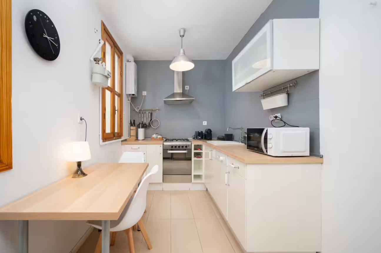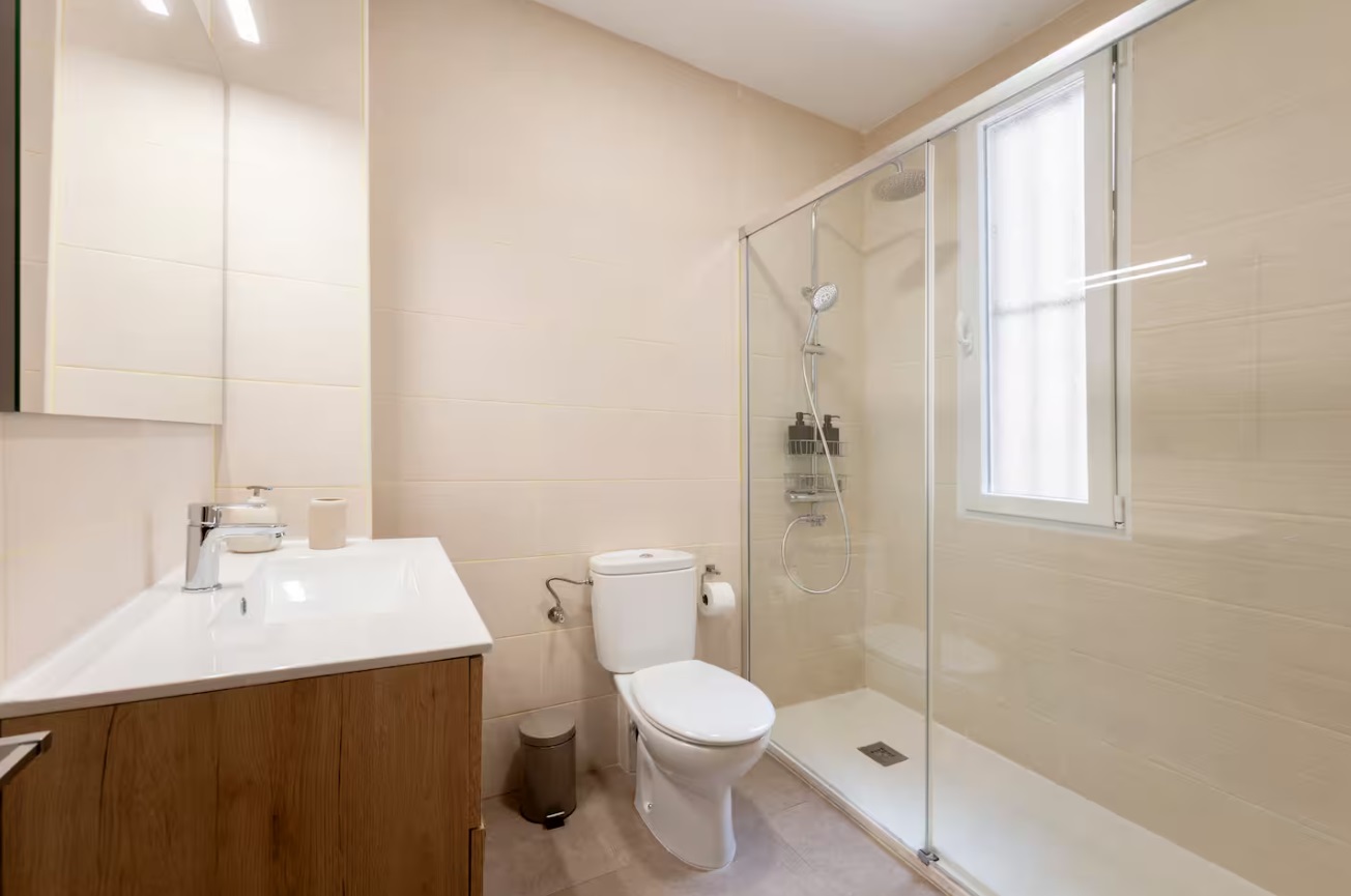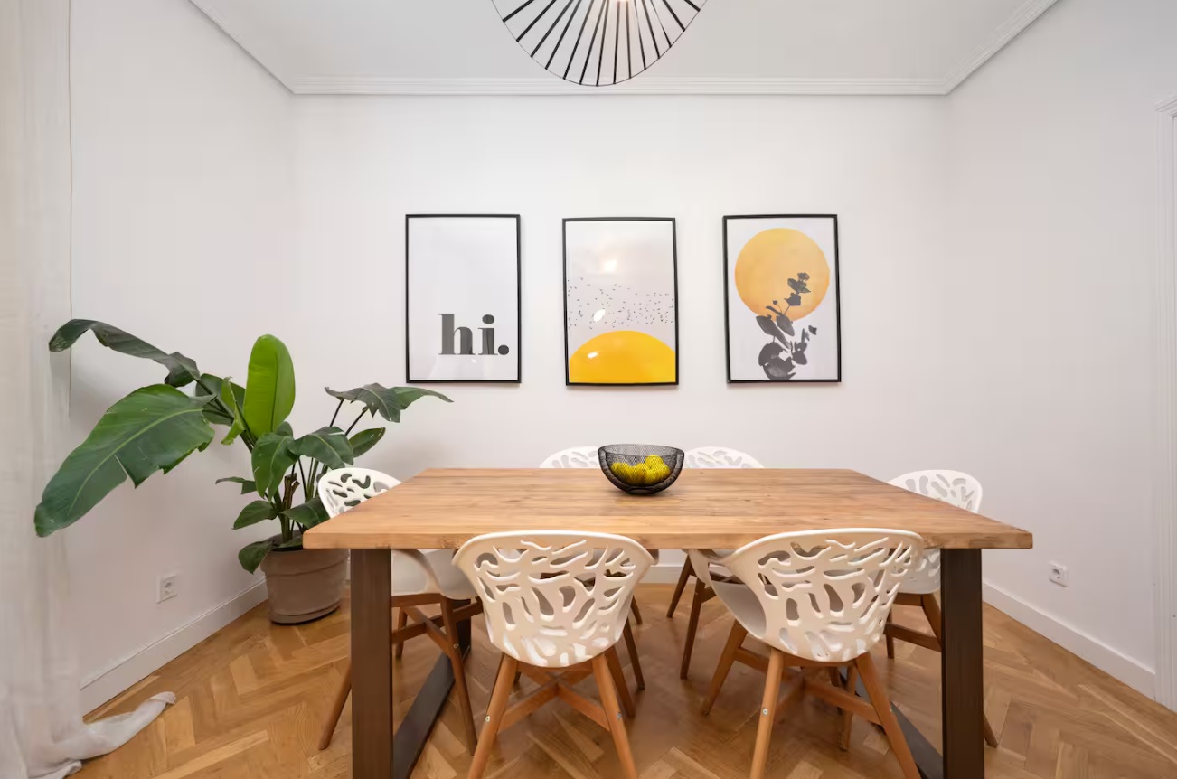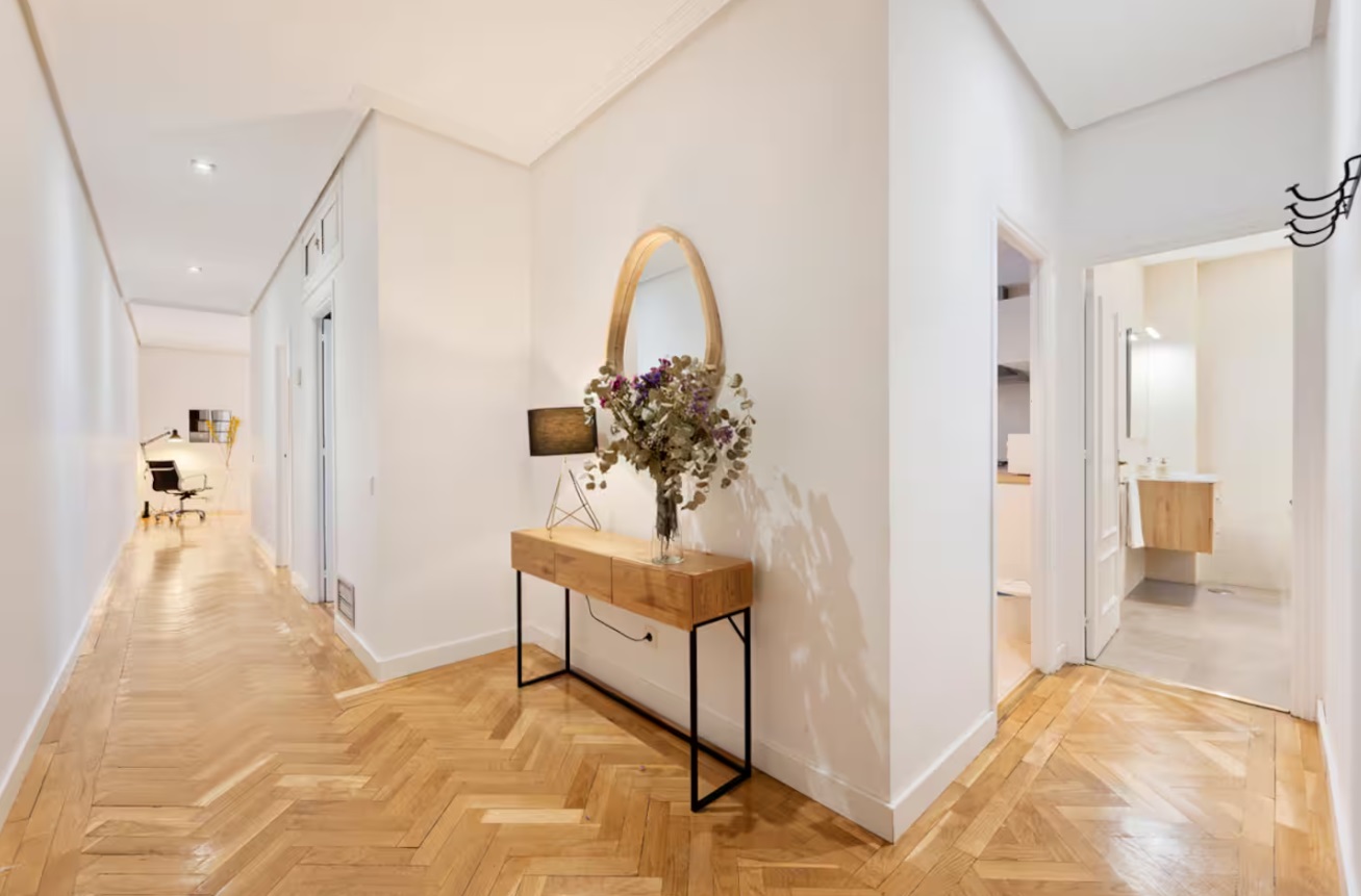 Es un piso señorial, espacioso y lleno de luz, decorado con elegancia y sencillez. El salón-comedor es muy luminoso y tiene dos balcones que dan a la calle Lope de Rueda. El comedor tiene capacidad para seis comensales. El apartamento dispone de dos dormitorios, el principal con cama matrimonial de 1,60 cm. El segundo dormitorio tiene dos camas de 90 cm cada una, y un sofá que se convierte en una cama de 1,40 (queen size).