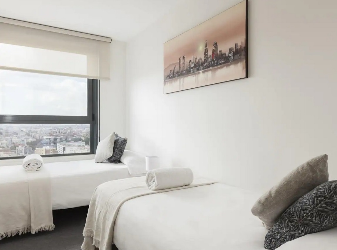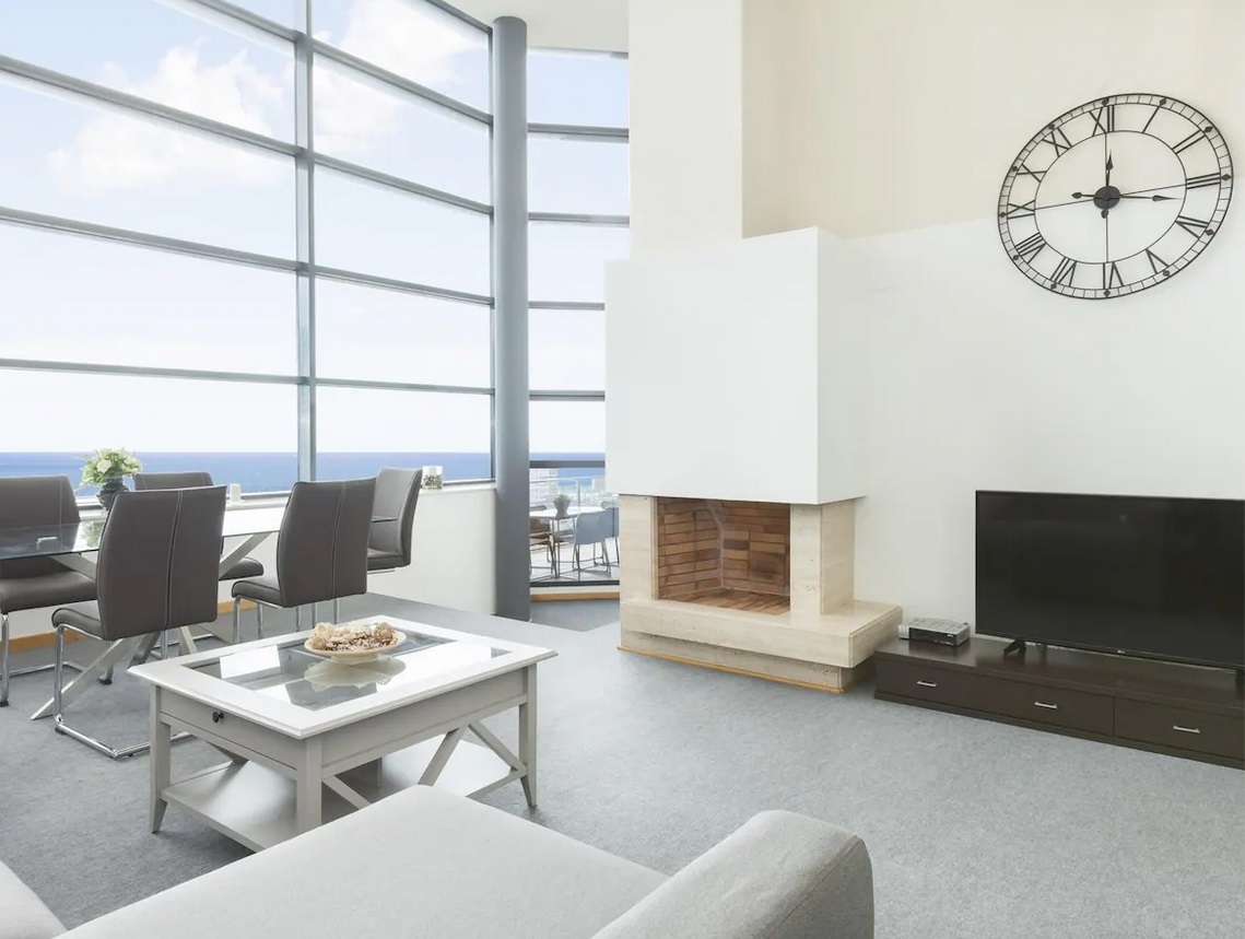 Este lujoso apartamento dispone de 4 dormitorios dobles: el dormitorio principal con una cama de matrimonio y tres habitaciones con dos camas individuales, que pueden devenirse en camas de matrimonio bajo petición. Los 3 cuartos de baño tienen acabados en mármol y tonalidades neutras.El comedor es muy luminoso gracias a los enormes ventanales que, a su vez, ofrece una vista muy bonita del mar. También cuenta con una terraza, equipada con una mesa y sillas.