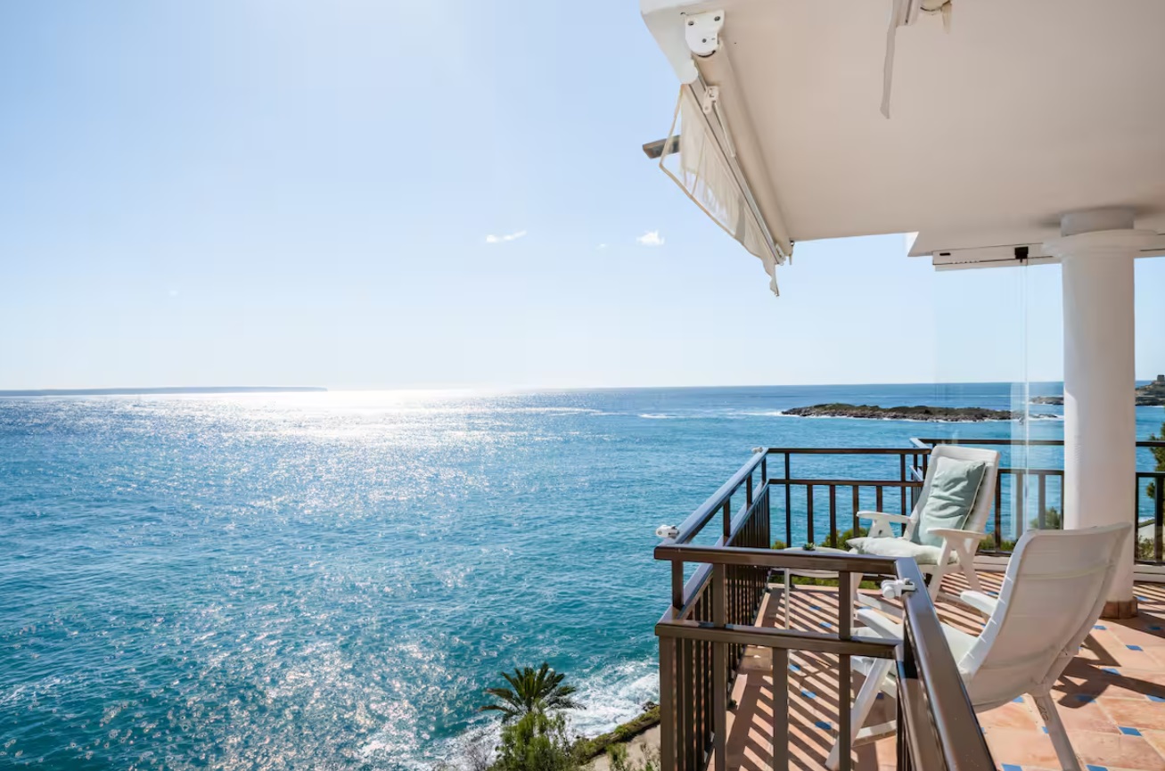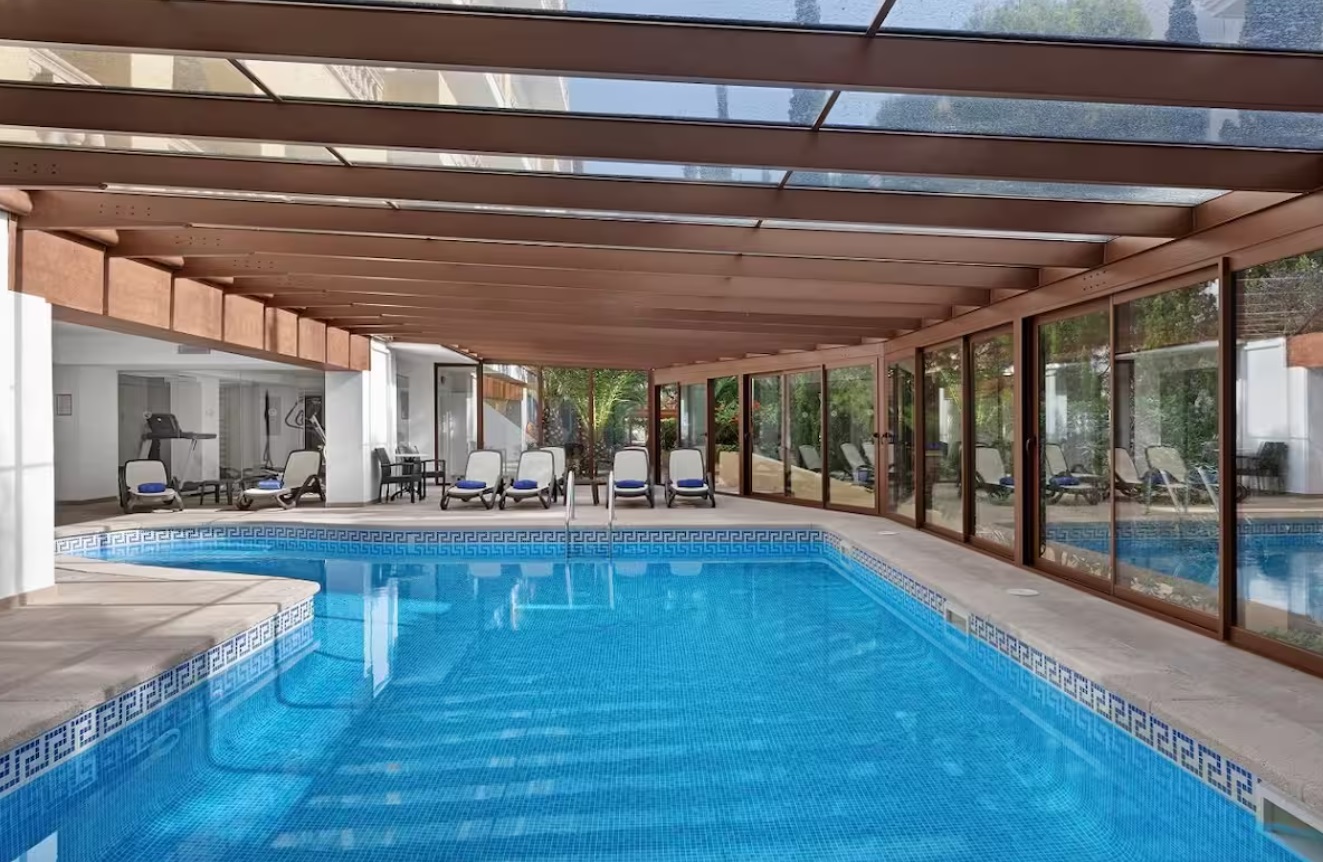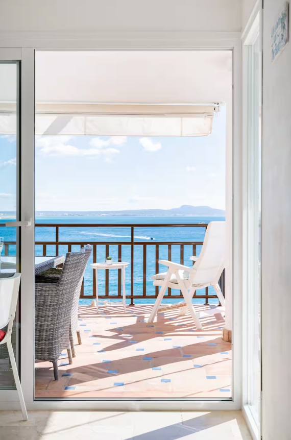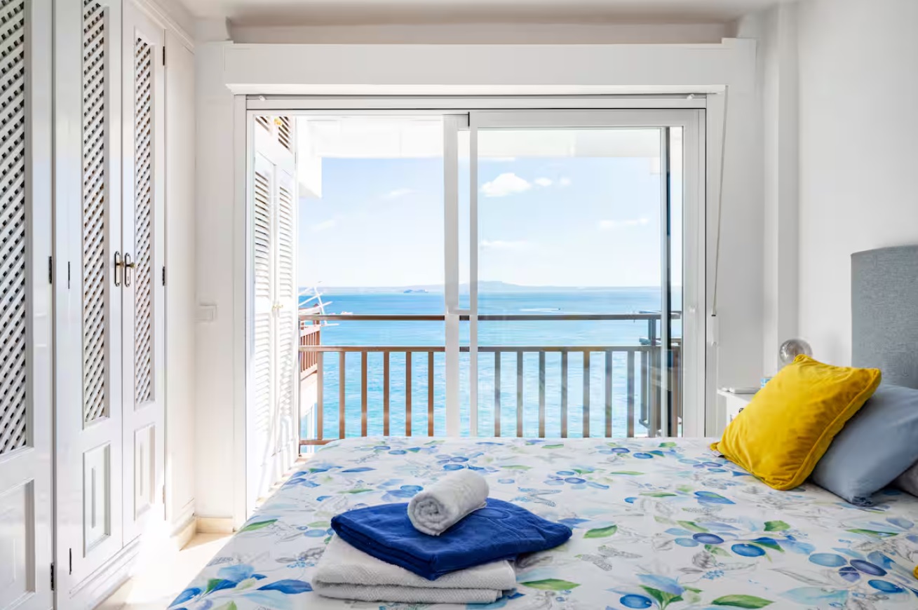 Tiene capacidad para 4 personas, viene totalmente equipado y los huéspedes se benefician del uso de todas las instalaciones del hotel: piscinas al aire libre y cubiertas, gimnasio, sala de vapor, solárium en la azotea, acceso directo al mar con un corto paseo hasta una playa de arena. El apartamento tiene una amplia sala de estar con comedor, una cocina totalmente equipada, dos dormitorios, uno principal con cama tamaño súper king, con acceso directo a la terraza y otro con 2 individuales, ambos con luces de ventilador y persianas en las ventanas, 2 baños, 1 en suite para el principal. Cuenta con una espaciosa terraza con vistas panorámicas a la bahía de Palma y está equipada con mesa de comedor, sillas y una parrilla/barbacoa eléctrica al aire libre.