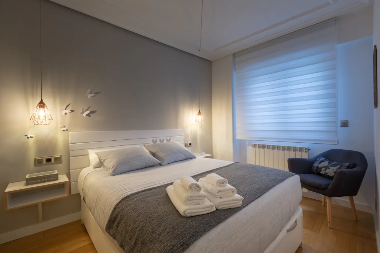 el 2º con una cama de 150x190cm, dos mesillas a cada lado de la cama, armario empotrado, sillón y una amplia ventana.