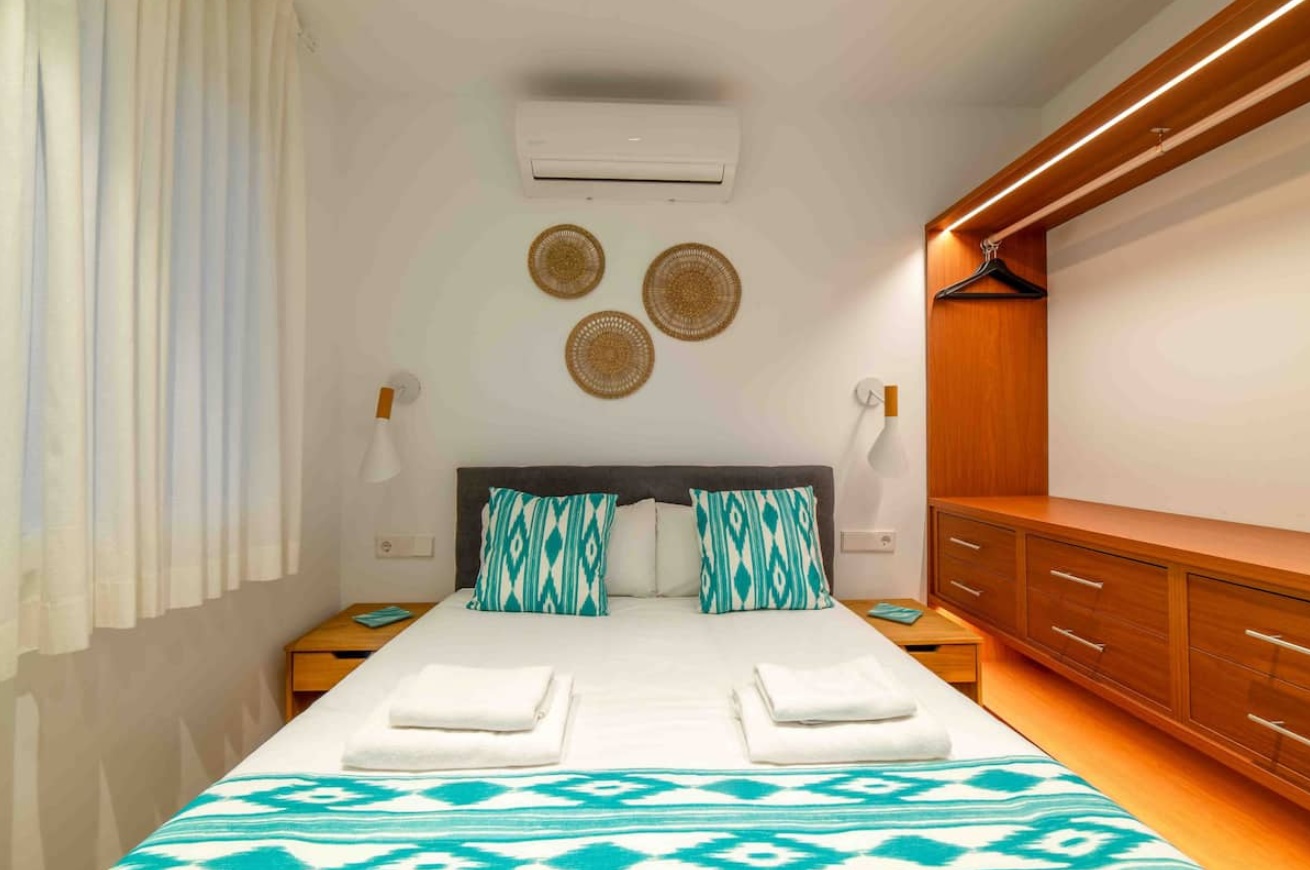 Habitación 2: Con cama de matrimonio de 135 y armario con espacio para guardar ropa en cajones y colgada con perchas.