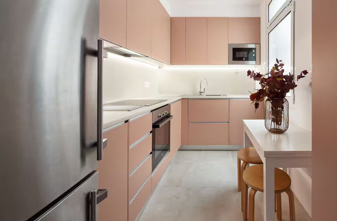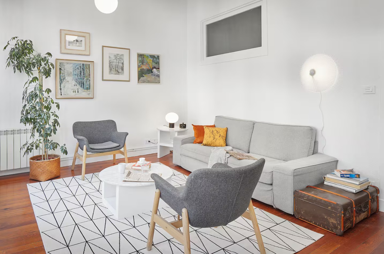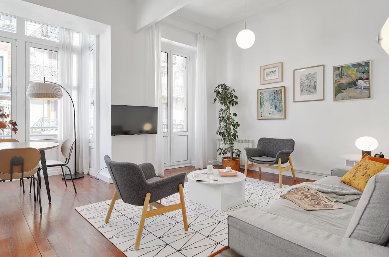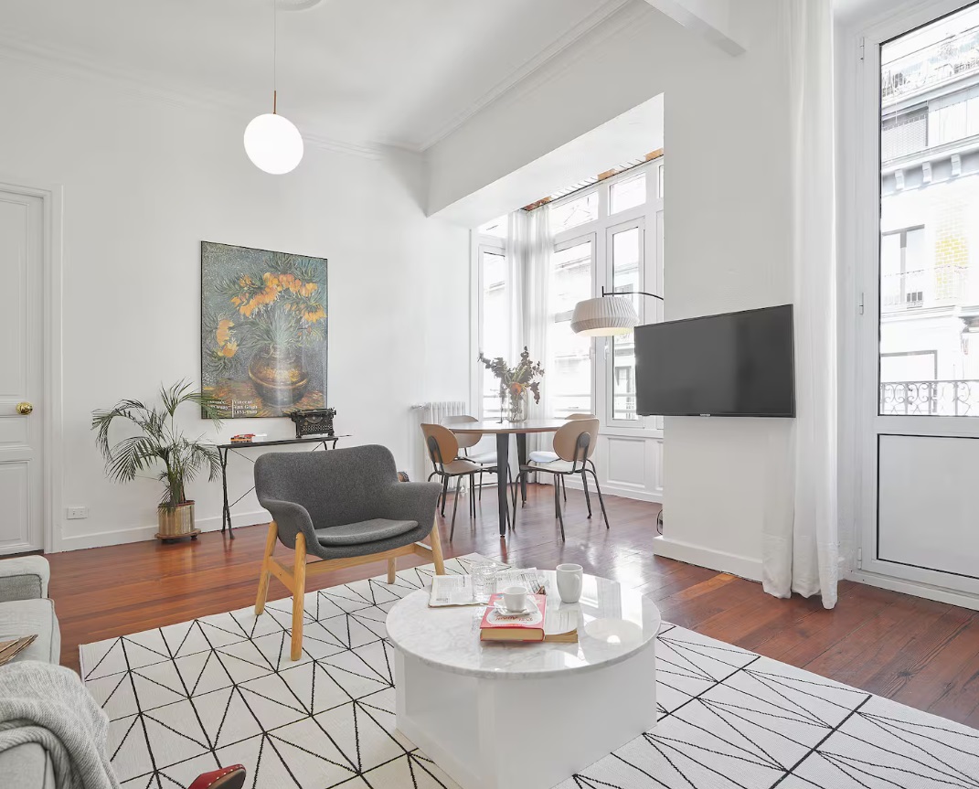 El apartamento, con una cuidada arquitectura interior, tiene un amplio salón-comedor con mobiliario de diseño. Desde el salón, se puede además disfrutar de un balcón y un mirador acristalado con vistas a la calle peatonal en la que se encuentra, junto a la famosa Avenida de la Libertad.